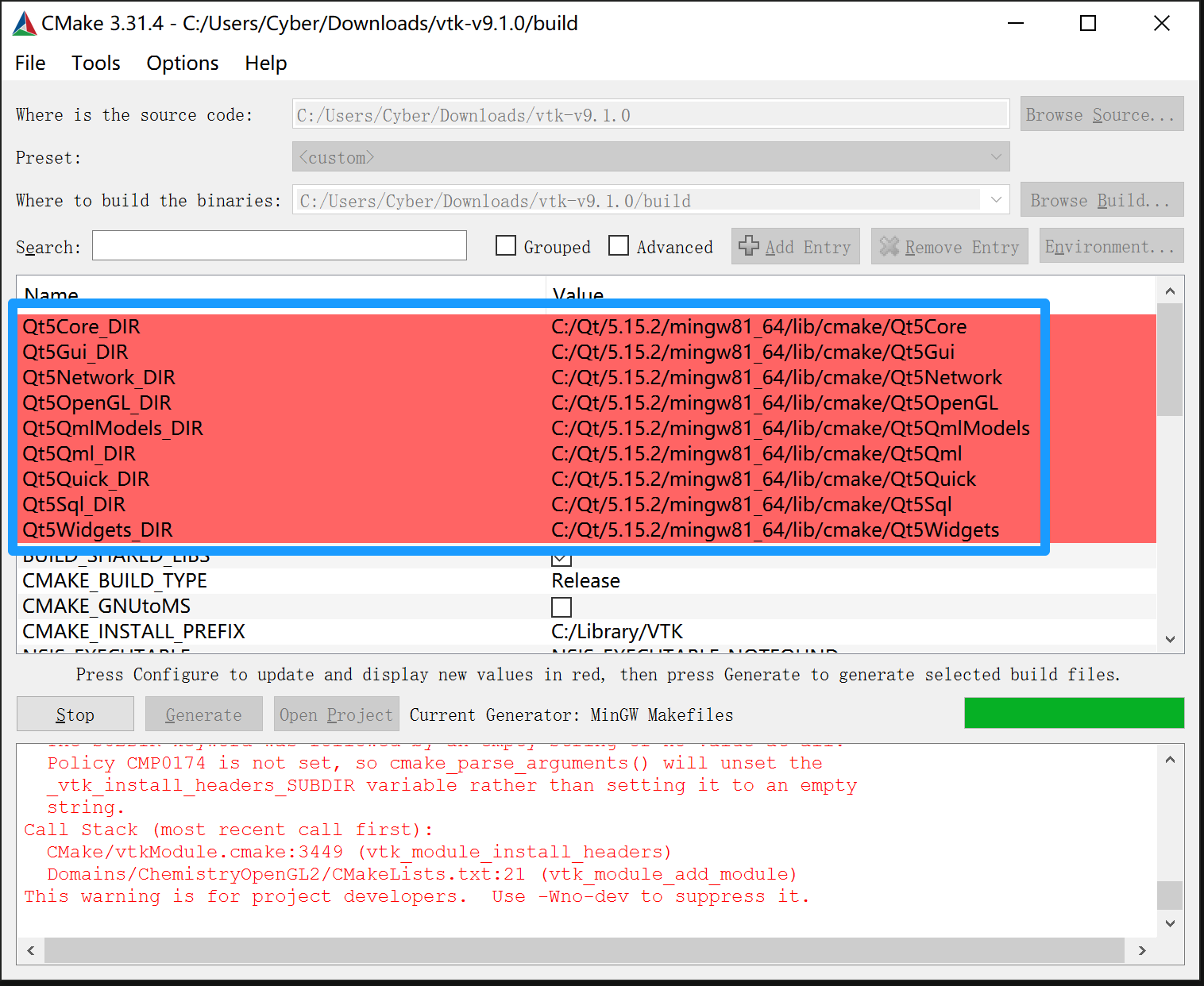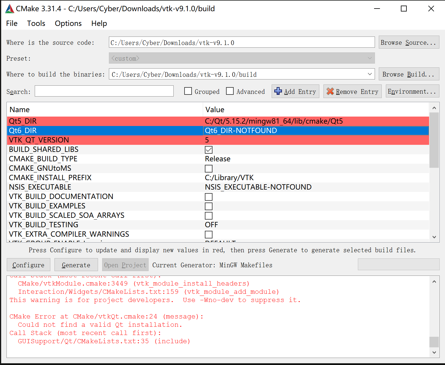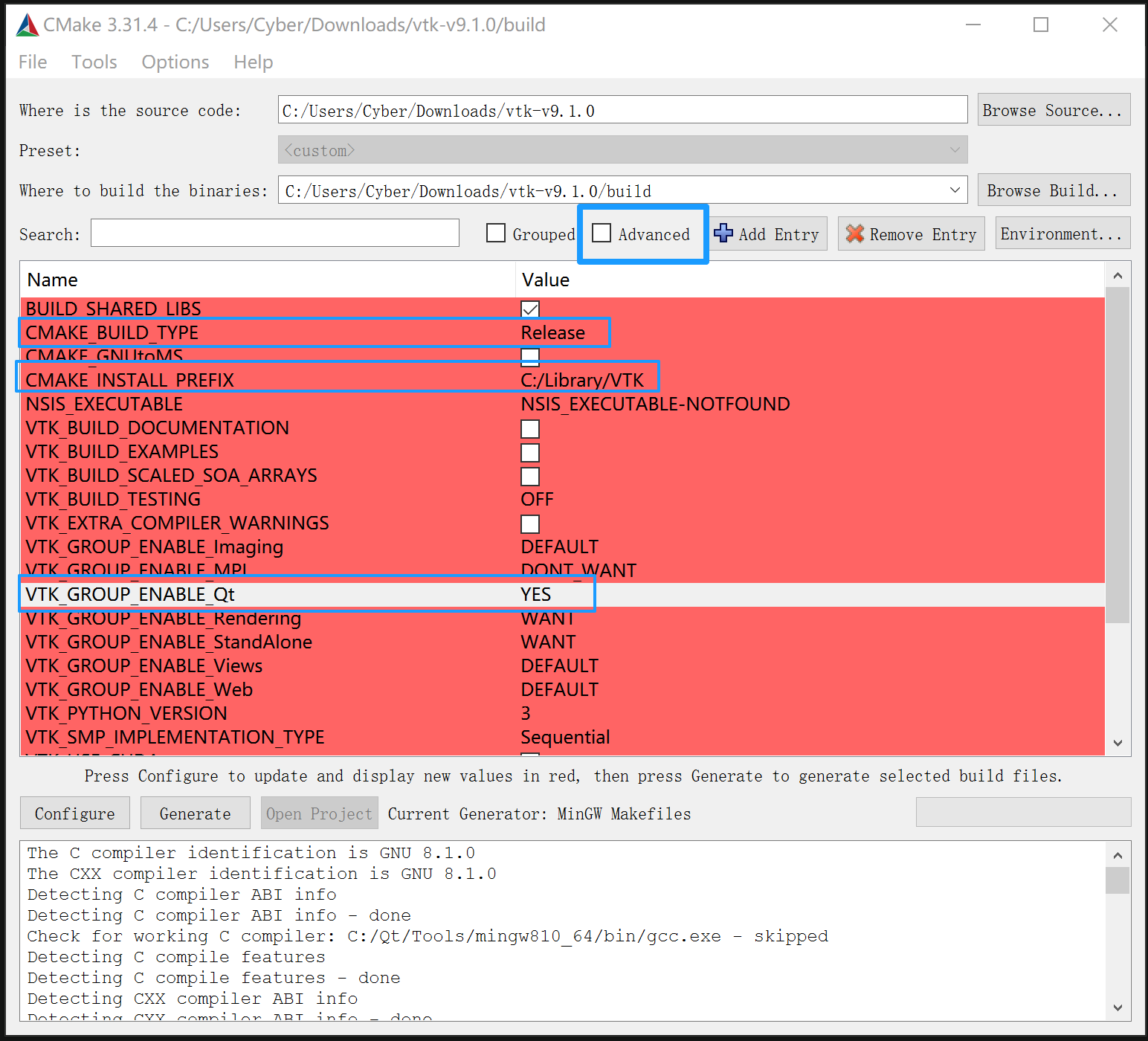 Name Value 描述 CMAKE_CXX_FLAGS -fcommon - CMAKE_C_FLAGS -fcommon - CMAKE_BUILD_TYPE Release 以Release的模式进行编译 CMAKE_INSTALL_PREFIX C:\Library\VTK 执行make install时的安装路径 VTK_GROUP_ENABLE_Qt YES 使能Qt选项