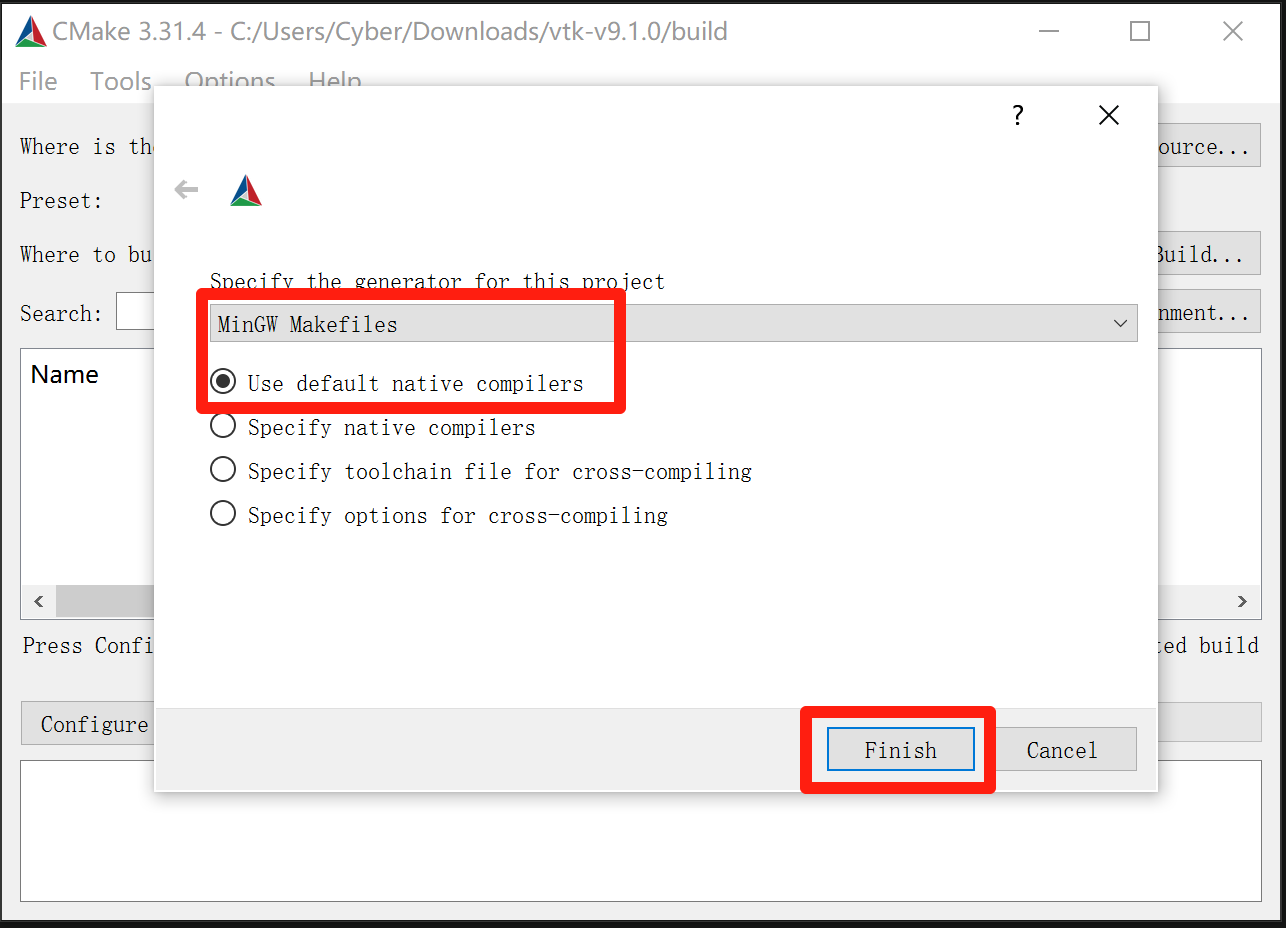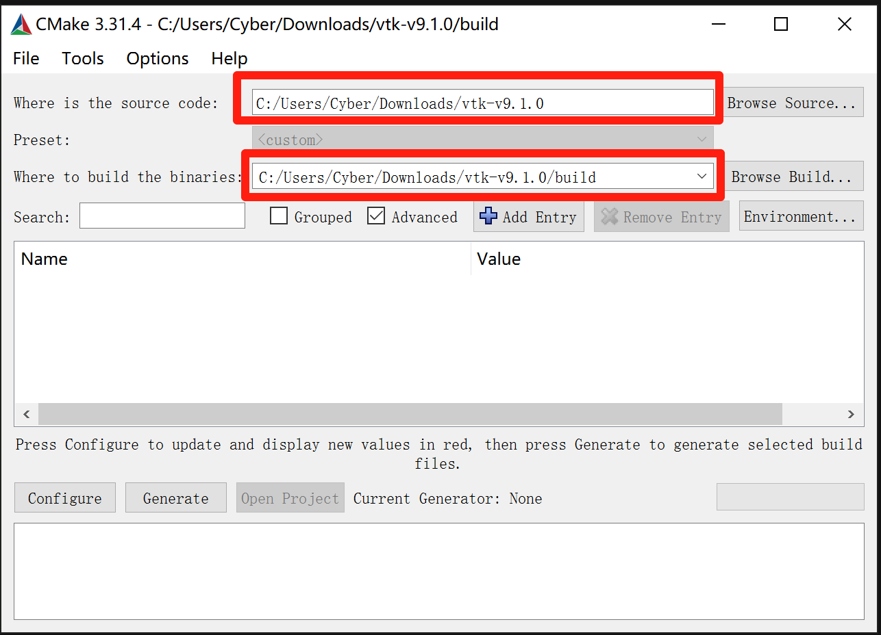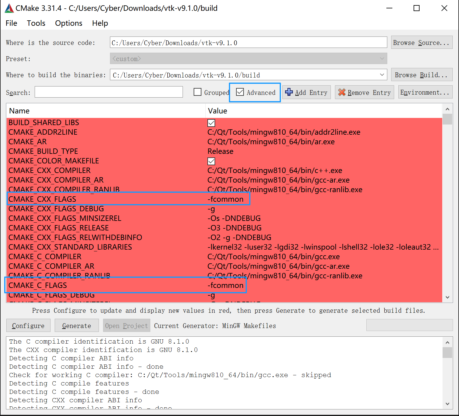 Name Value 描述 CMAKE_CXX_FLAGS -fcommon - CMAKE_C_FLAGS -fcommon - CMAKE_BUILD_TYPE Release 以Release的模式进行编译 CMAKE_INSTALL_PREFIX C:\Library\VTK 执行make install时的安装路径 VTK_GROUP_ENABLE_Qt YES 使能Qt选项