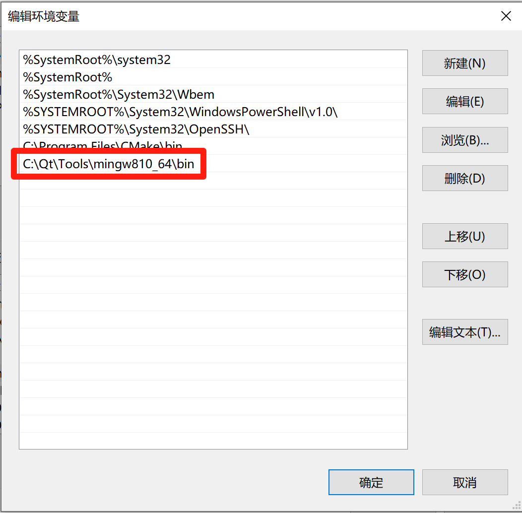 - 前置操作: 将Qt5.15.2中的mingw810_64的bin目录添加到系统环境变量中,并重启操作系统, 如: